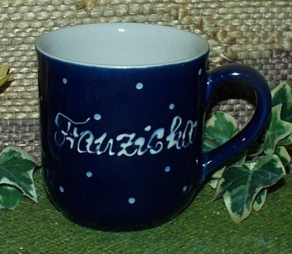 Das jeweilige Foto zeigt genau die Tasse, die Sie erhalten werden. Inhalt 250 ml - 9 cm hoch - 8 cm Durchmesser Hergestellt von RKM Rheinsberger Keramik Manufaktur Handmalerei in Unterglasurtechnik auf einer schadstofffreien Kobaltengobe, überzogen mit einer transparenten glänzenden Glasur. Der Schriftzug und das Dekor (die Punkte) werden vor dem 2. Brand mittels Malhörnchen von Hand aufgetragen und sind in die Glasur eingeschmolzen. Das Feinsteinzeug wird zweimal gebrannt bei 1.250°C und ist daher spülmaschinen-, mikrowellen-, ofen- und kantenfest. Auch nach längerem Gebrauch bekommt das Gebrauchsgeschirr keine Haarrisse.
